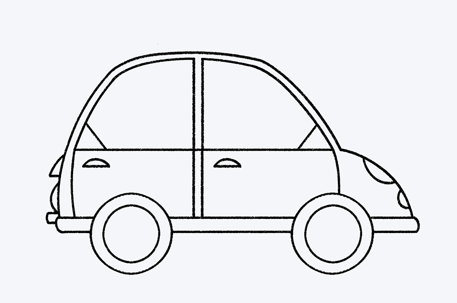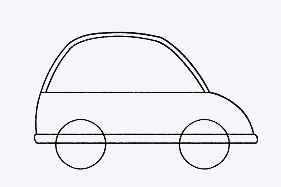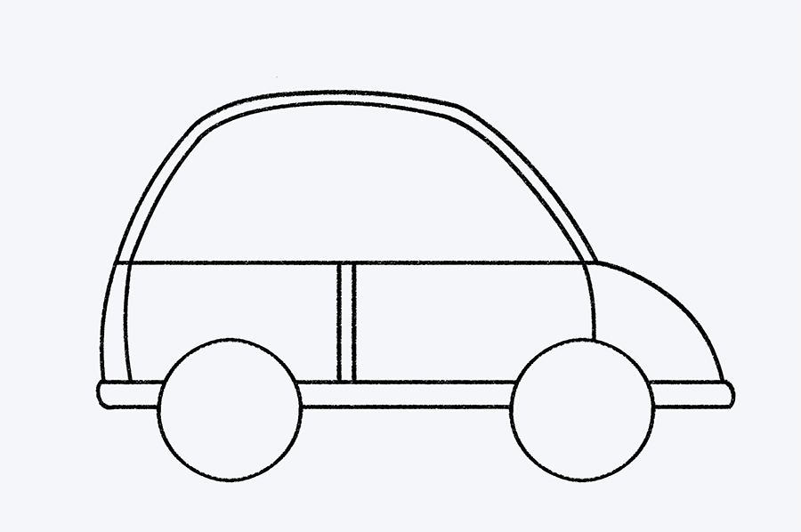Es momento de agregar las puertas para que los pasajeros puedan entrar. Dibuja una curva más pequeña dentro del techo del auto para formar el marco de las ventanas. Luego, traza tres líneas verticales hacia abajo. Estas líneas marcarán los bordes de las puertas y ayudarán a definir mejor la estructura del vehículo.