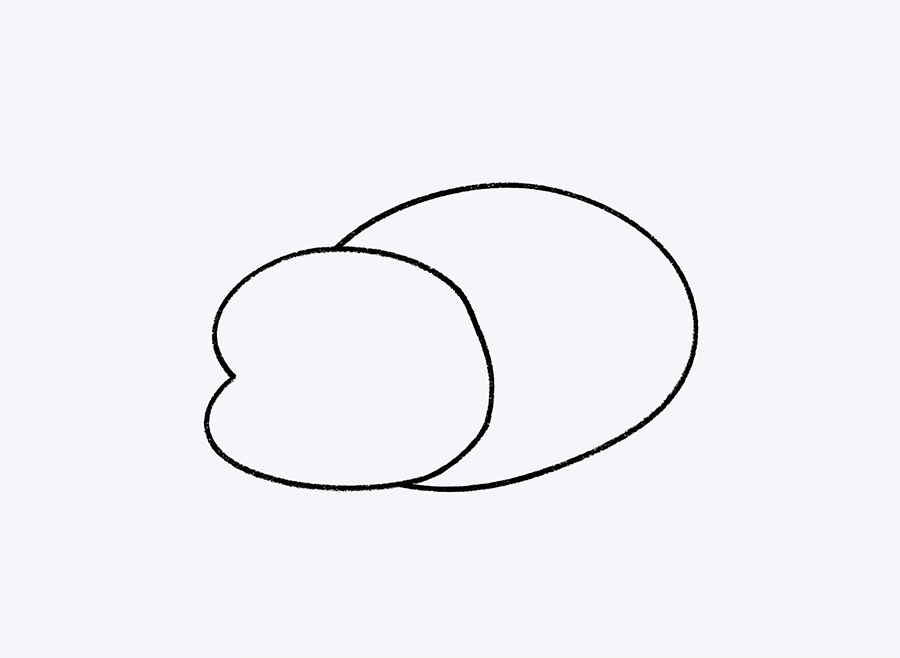 Después, suaviza la unión entre los dos óvalos en la parte derecha, donde la cabeza se encuentra con el cuerpo. Redibuja esa zona con una línea más fluida, para formar una frente definida y unas mejillas redondeadas.