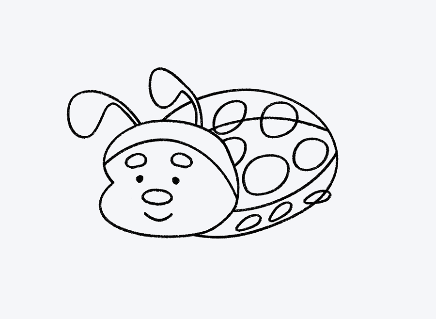 Vamos a darle más personalidad a tu mariquita. Empieza dibujando dos líneas delgadas y curvas que salgan desde la parte superior de la cabeza. En la punta de cada línea, añade una pequeña bolita o círculo. Estas antenitas harán que tu personaje se vea aún más tierno y simpático.