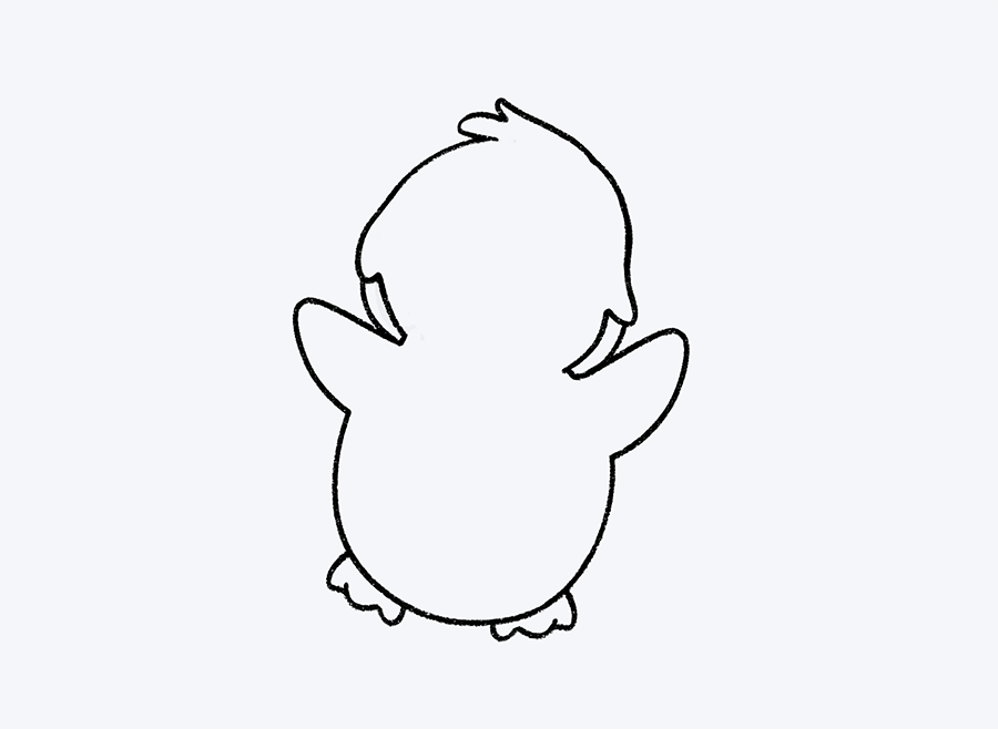 Ahora vamos a dibujar las patitas de nuestro pingüino. En la parte inferior del cuerpo, agrega dos pequeñas aletitas en forma de pies. Cada una debe tener tres puntas redondeadas, como si fueran montañitas suaves, tal como puedes ver en el ejemplo.