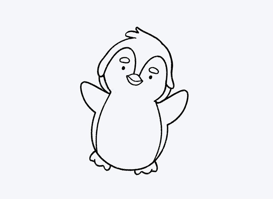 A diferencia de otros animales, los pingüinos no tienen brazos, sino dos alas en forma de aletas. En este paso, vamos a dibujarlas levantadas hacia arriba, como si nuestro pingüinito estuviera saludando con alegría o a punto de dar un gran abrazo.
