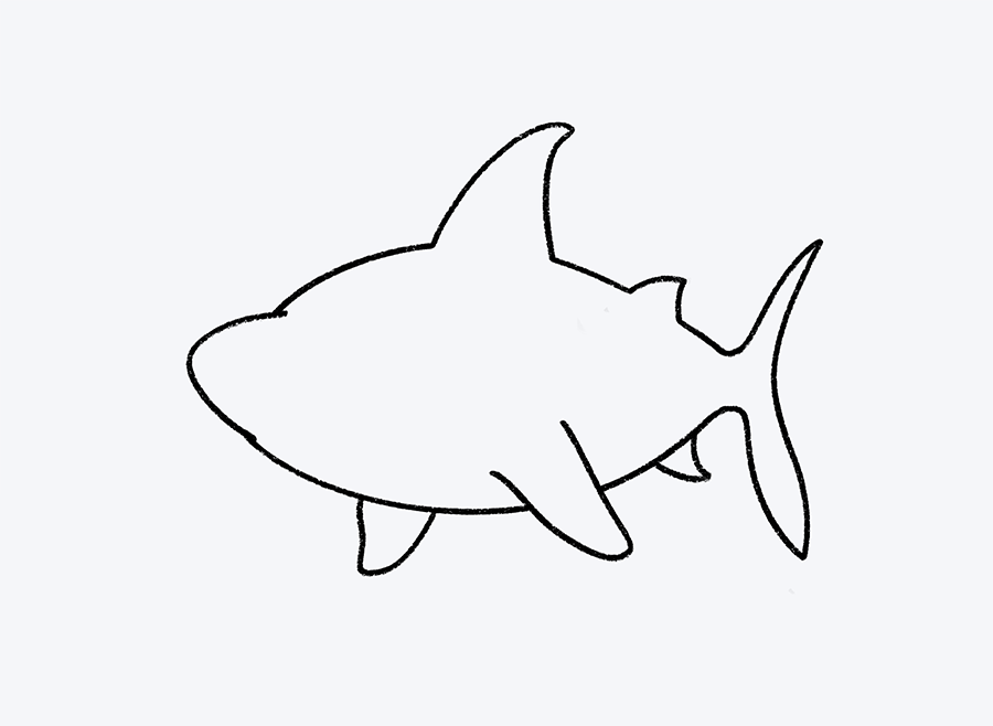 A partir del cuerpo que dibujamos en el paso anterior, vamos a añadir las aletas, el hocico y la cola, que le dan al tiburón su aspecto poderoso.
