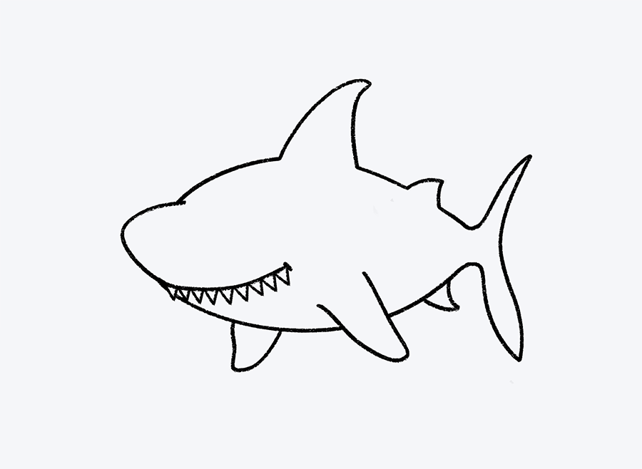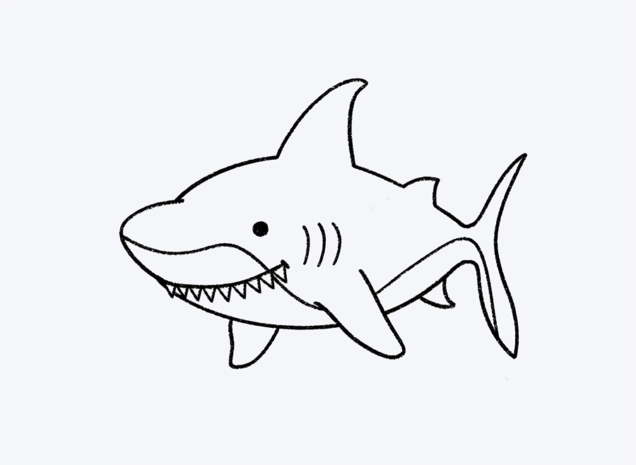 Muy bien, has terminado tu dibujo de un poderoso tiburón. Practica las veces que quieras y prueba diferentes expresiones o formas para que cada tiburón sea único.